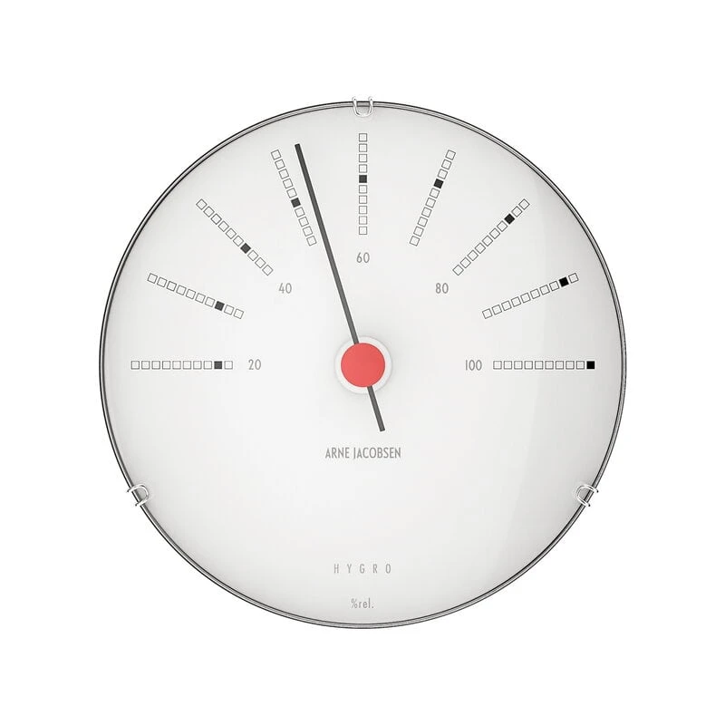 L’hygromètre minimaliste AJ Bankers est doté d’un cadran monochrome présentant des chiffres, des petits carrés de couleur, des aiguilles noires, une façade en verre convexe et un détail rouge au centre. Le boîtier spécial en aluminium donne l’impression que le baromètre flotte lorsqu’il est monté sur le mur. Assemblez une belle station météo avec l’horloge murale, le thermomètre, l’hygromètre et le baromètre AJ Bankers.