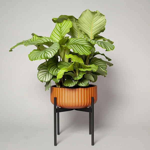 La jardinière surélevée Klorofyll d’Elementa se compose d’un pot de fleurs peu profond et d’une base minimaliste qui offrent un cadre élégant à une variété de plantes d’intérieur. Le pot de couleur terre cuite est en béton pigmenté, tandis que le support géométrique et simple est en métal noir thermolaqué.