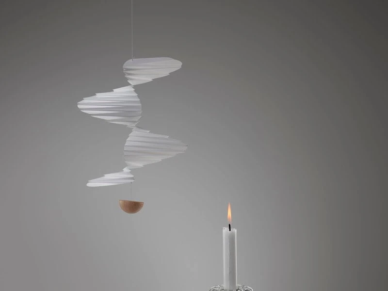 Le mobile Airflow 17 de Flensted Mobiles séduit par son escalier en colimaçon blanc qui tourne joliment au contact d’un courant d’air. Conçu par Carina Caia, le mobile Airflow a été réalisé à partir d’une fine feuille de sérigraphie blanche et d’une demi-sphère en bois suspendue en dessous.
