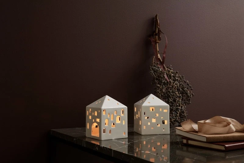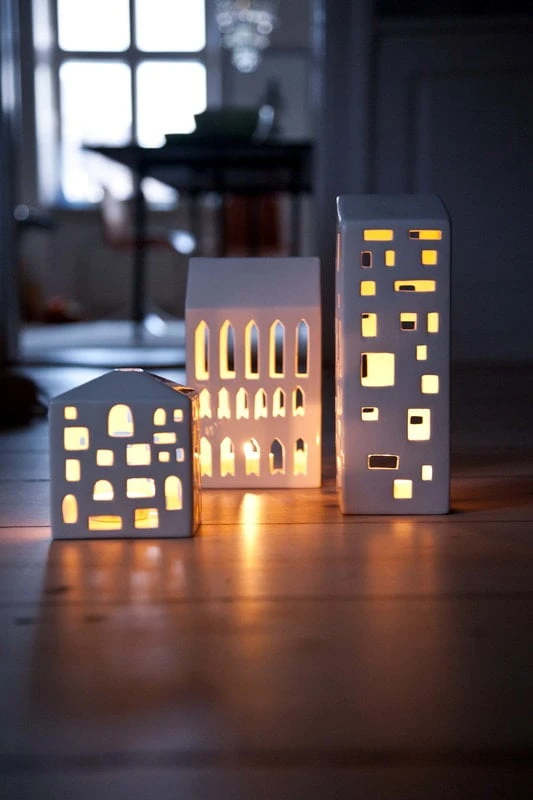 Les lanternes Urbania de Kähler offrent une alternative moderne aux lanternes plus traditionnelles en forme de maison. Les lanternes en céramique, conçues par Mette Bache et Barbara Bendix Becker, représentent une variété de bâtiments où la lumière des bougies, reflétée par des fenêtres de formes diverses, crée des motifs fascinants dans leur environnement.