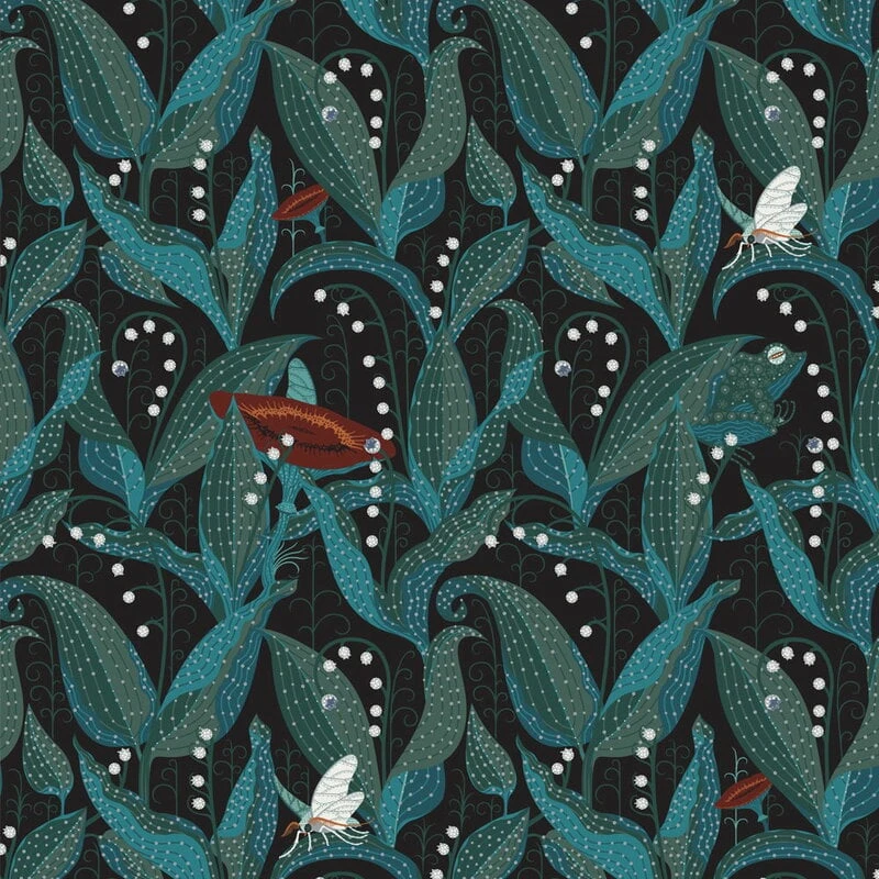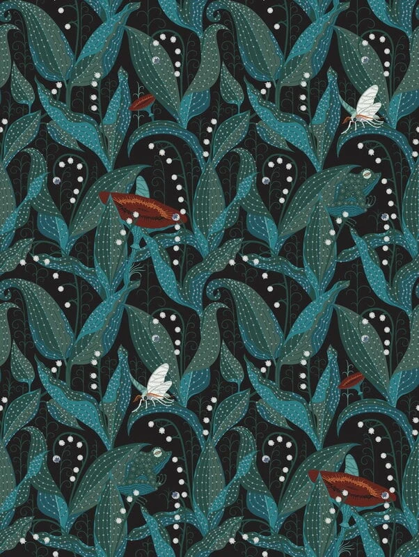 Le papier peint Lily of the Valley de Klaus Haapaniemi arbore un motif d’inspiration art déco composé de fleurs délicates, de papillons et de petites grenouilles qui se cachent dans les feuilles. Klaus Haapaniemi, l’un des grands noms du design finlandais contemporain, a conçu une collection de papiers peints aux couleurs intenses et aux motifs audacieux inspirés de la nature et du mysticisme nordiques.