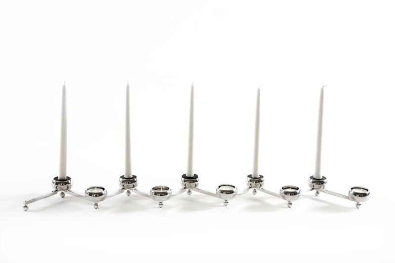 Le bougeoir Constella de Klong permet de disposer des bougies chauffe-plat en une élégante constellation géométrique de la forme de votre choix. Conçus par Eva Schildt, les bougeoirs Constella attirent le regard, y compris sur les grandes tables et lors de célébrations. Le bougeoir pour 5 bougies chauffe-plat a une longueur maximale de 64 cm, et celui pour 10 bougies s’étend jusqu’à 124 cm. En plus des bougies, vous pouvez également placer des petites décorations ou des fleurs dans les coupes.