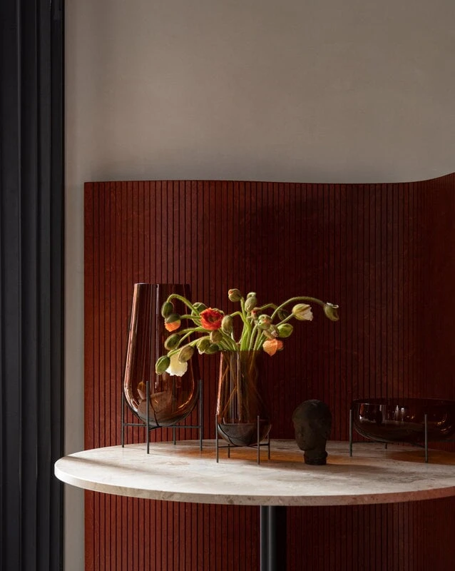 Le vase Échasse de Menu est la version contemporaine de Theresa Rand des élégants vases traditionnels en verre. Rand vise à créer des objets à la fois poétiques et fonctionnels. Échasse a un design en forme de goutte qui est inspiré des tubes à essai utilisés dans les laboratoires. Son nom français fait référence à la base en laiton élancée qui surélève le récipient en verre au-dessus du plateau de la table. Grâce à leur fond plat, les vases et bols Échasse peuvent également être utilisés sans leur base en laiton.